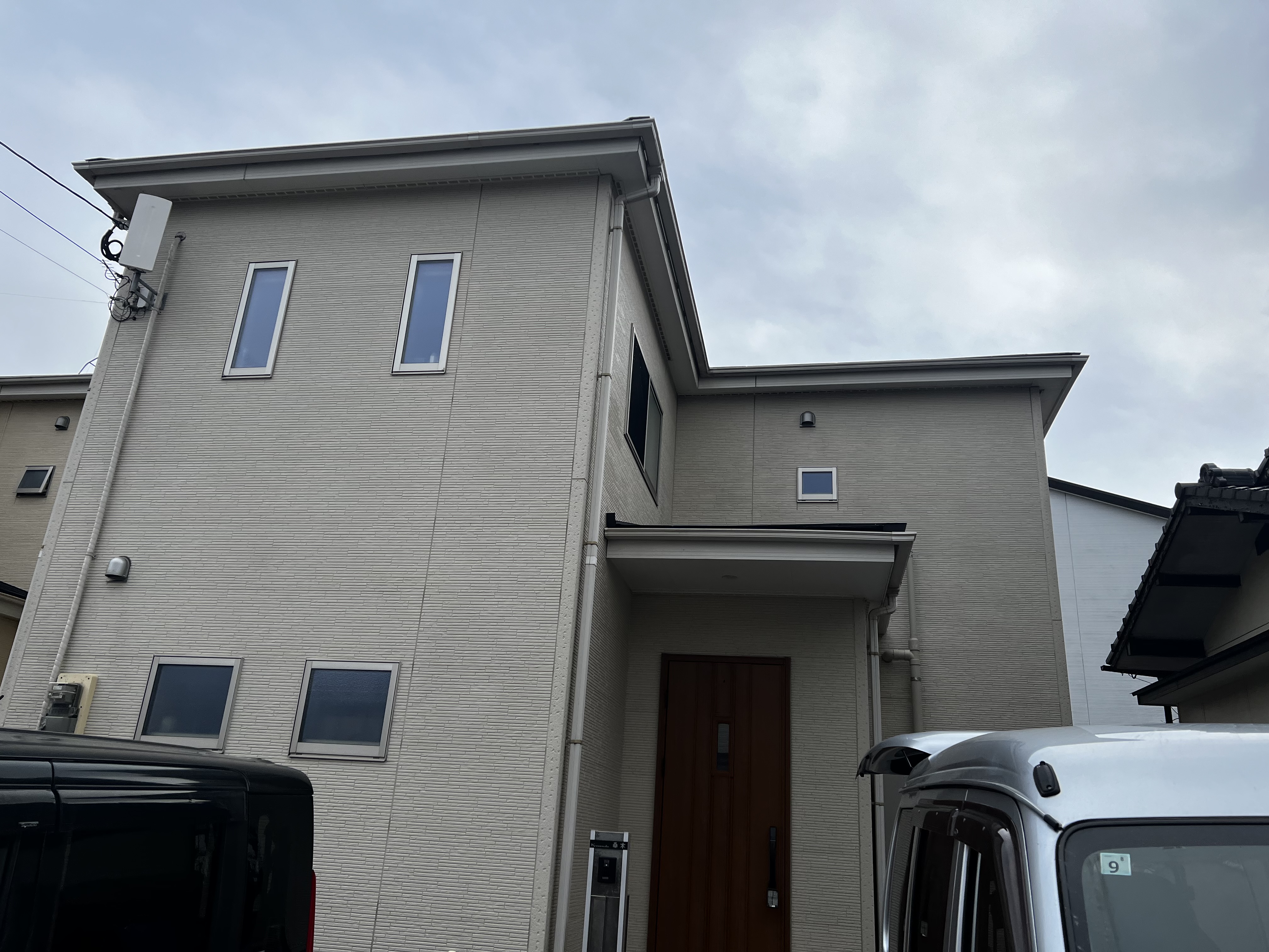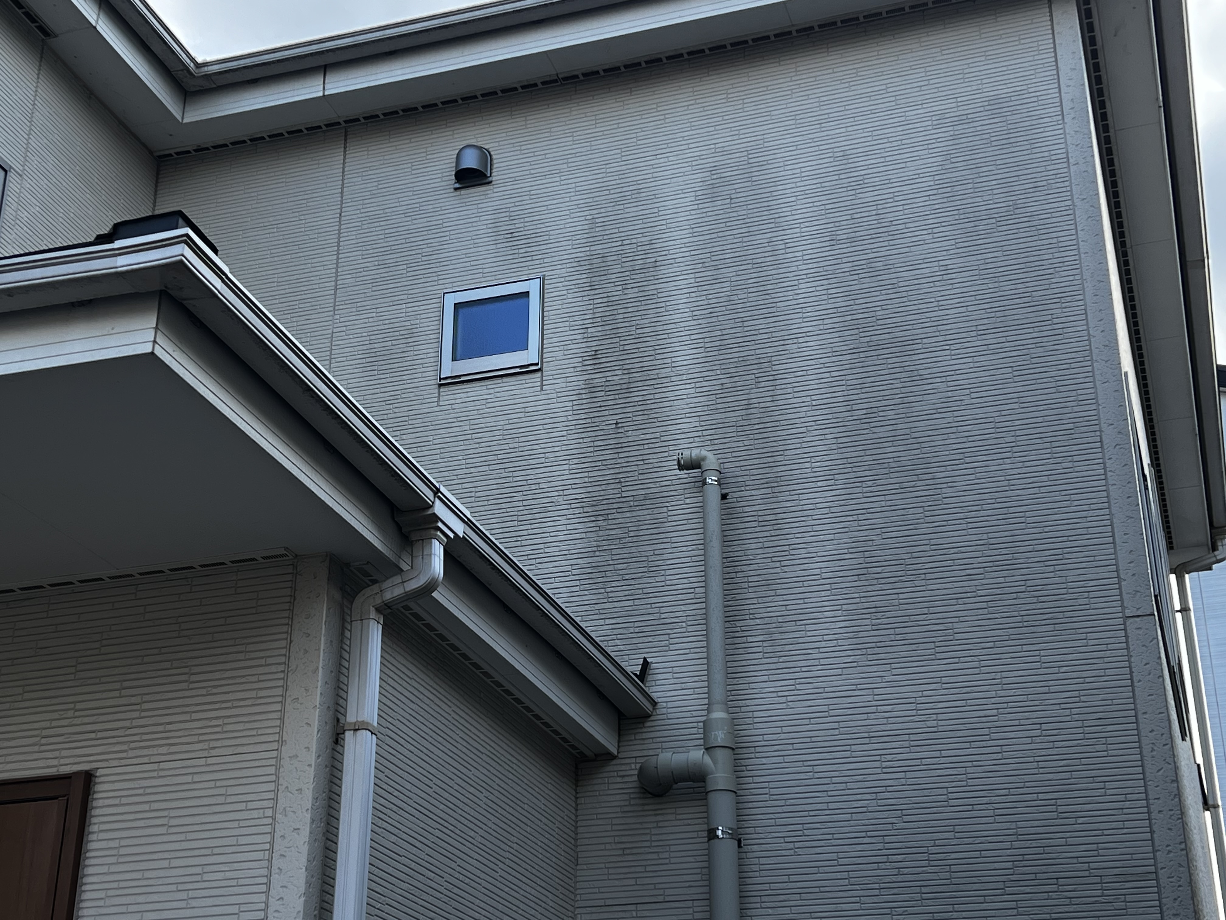 玄関正面、大気汚染等による汚れで玄関正面2F部分が黒く汚れていました。北側の外壁は隣に家があり、日光が当たりにくい為、藻と黒い汚れがある状態でした。
