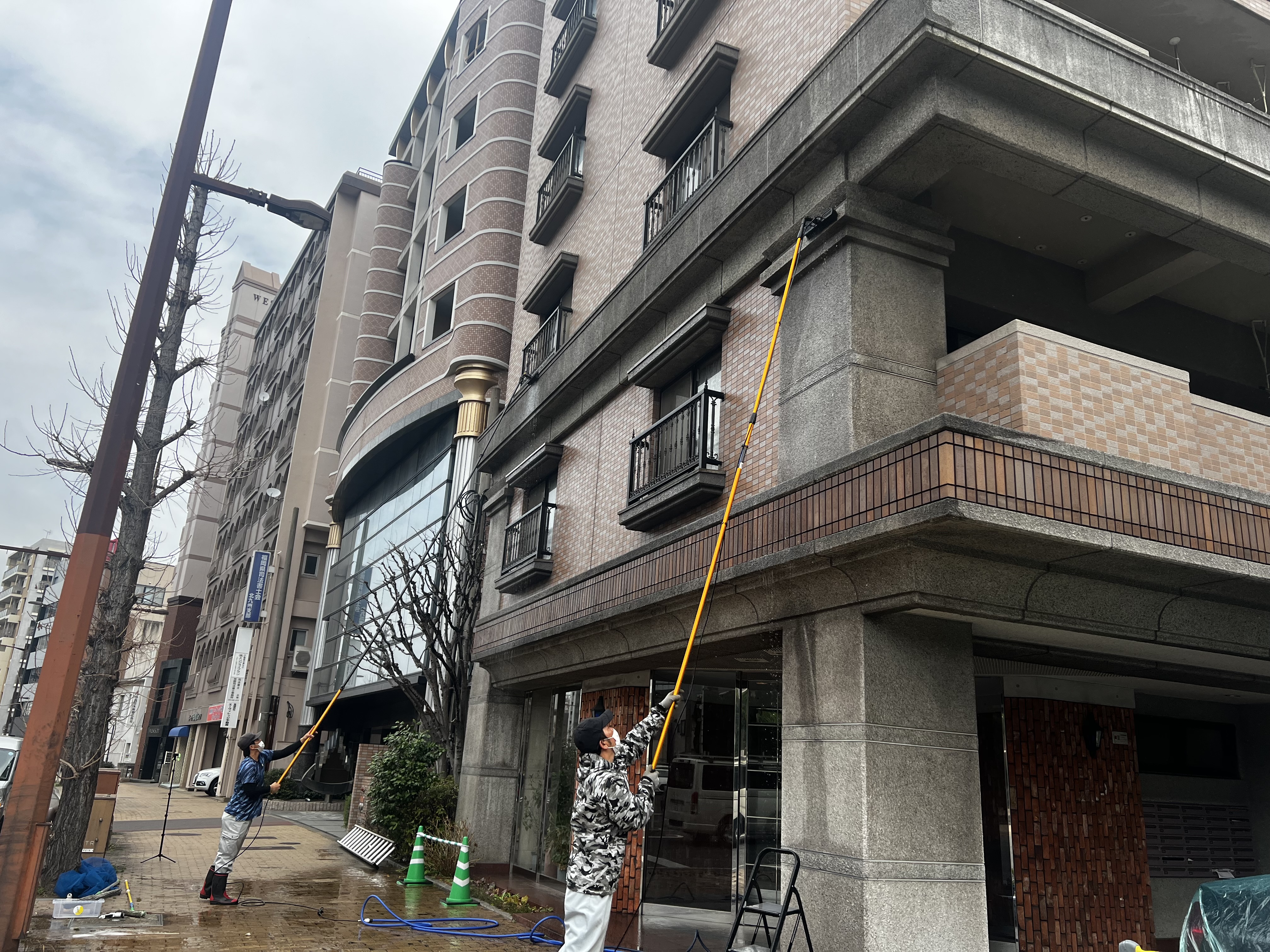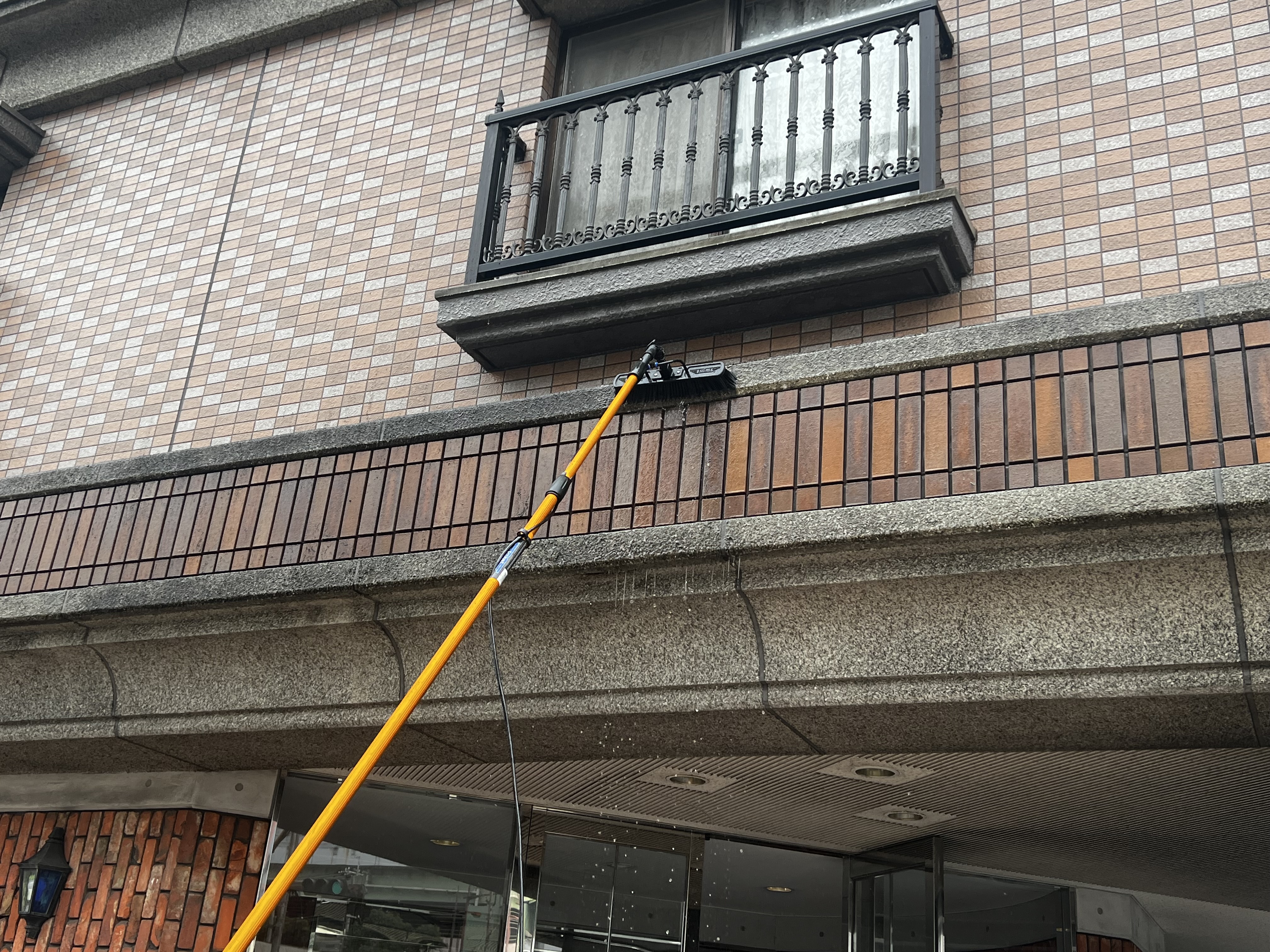 この高さだと足場を立てないと手が届きませんよね。でも弊社なら長い柄のポールを使いブラシと専用洗剤を使い『ゴシゴシ』キレイに落とすことができます。