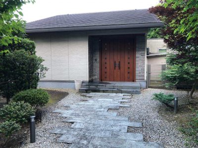玄関側の白い外壁サイディングの外壁洗浄をさせていただきました。長年の蓄積された汚れで黒く汚れておりました。今回もキレイに洗浄することができました。